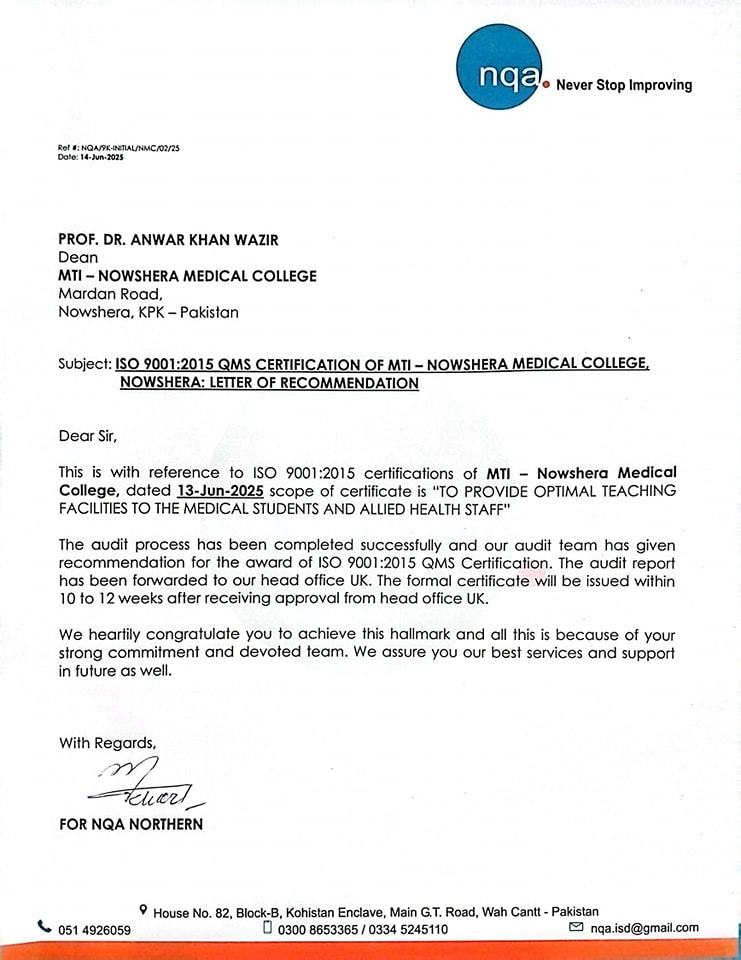 MTI – Nowshera Medical College has been recommended for ISO 9001:2015 QMS Certification by NQA - Nowshera Medical College, Nowshera